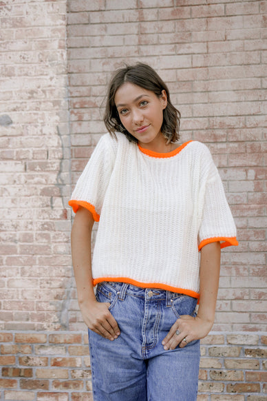 Piper TopPiper brings a fresh twist with its loose cream knit and bright orange trim. Lightweight and breezy, it’s perfect for warm days, layering over tanks, or adding a pop of color to your denim.